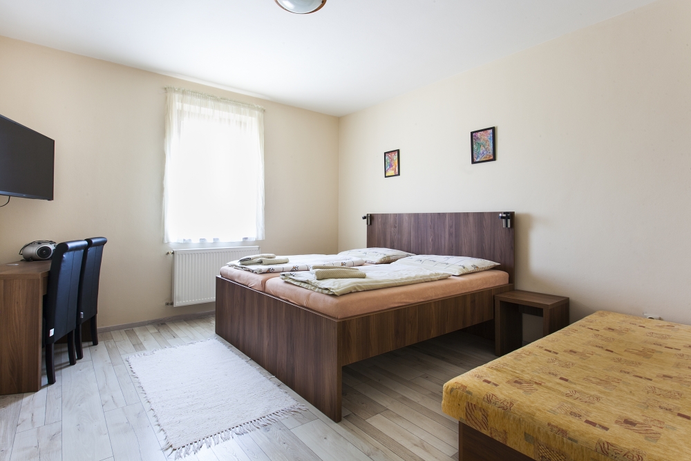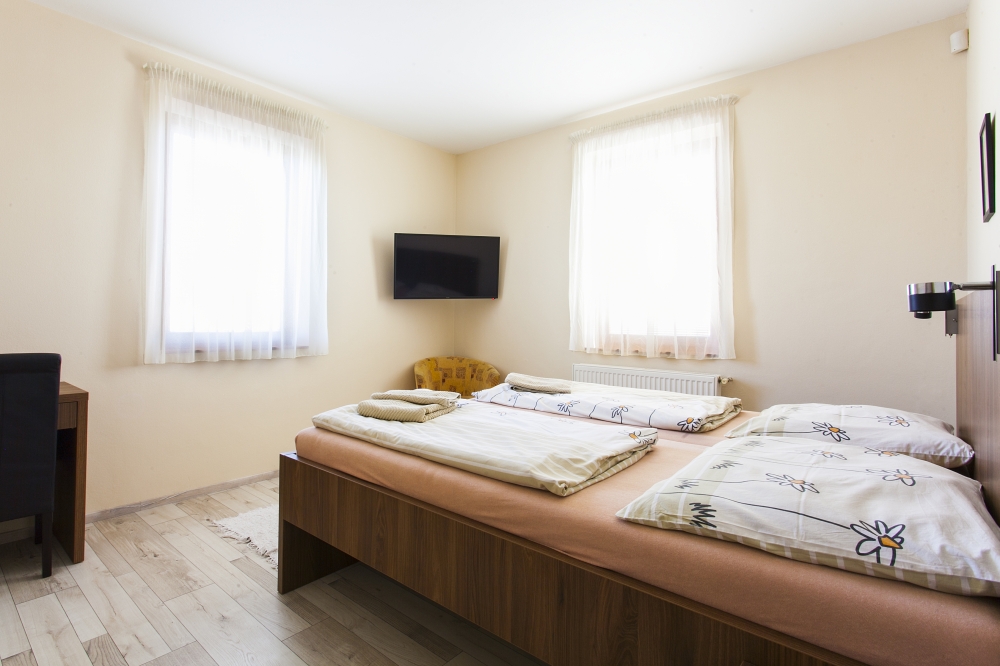 vybavenie izieb: televízor, rádio, 2× posteľ s nočnými lampičkami, stolík s kreslami a klimatizácia